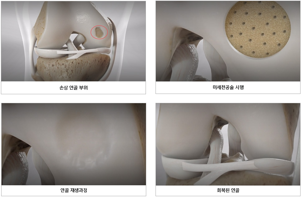 크기가 작은 손상 연골부위에 작은 구멍을 여러게 뚫어 골수를 자극하여 손상부위의 출혈을 유도하여 혈액성분이 혈종으로 형성되어 손상부위를 매꾸고 섬유연골 조직이 재생토록 합니다.