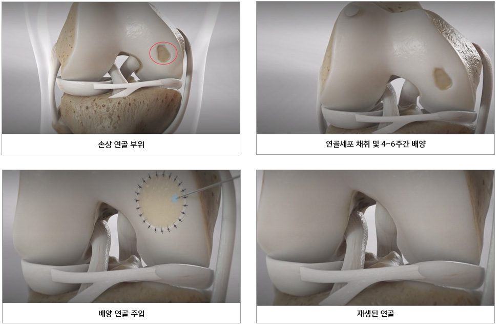 환자 본인의 연골세포를 체취하여 4주~6주간 배양하여 필요한 양의 연골세포를 확보한 후 다시 손상부위에 이식합니다.