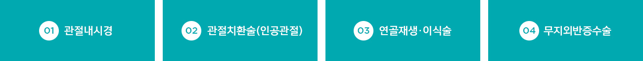 노화와 비만, 각종 스포츠질환, 사고부상에 따라서 관절기능 또한 치아의 마모와 같이 소모되어 질환으로 증상이 나타납니다. 누적된 관절의 피로와 각종 충격은 연골손상, 퇴행성·염증성 질환을 일으켜 욱씬거리는 통증에 걷거나 팔을 들기도 힘들고 운동도 하기 어렵게 만듭니다. 이러한 증상에 대하여 경증에 따라 직접 절개수술도 하지만 근래 들어 관절내시경시술이 도입되어 큰 수술 없이 빠른 치료가 가능하게 되었습니다.