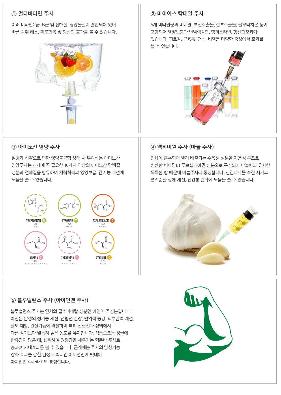 수액클리닉에서는 다양한 수액 주사를 활용하여 불규칙적인 생활, 만성 피로와 통증, 급격한 체력 소모, 과음으로 힘들어 하거나 건강미용을 원하는 분들에게 적절한 영양성분을 정맥주사로 빠르게 공급하여 항노화, 피로회복, 피부개선, 결핍영양 보충 등 각종 기대효과를 볼 수 있습니다. 주의사항 : 주사 후 기대효과가 미흡하거나 드물게 신기능부담 등의 부작용이 발생할 수 있어 미리 의료진과의 상담이 필요합니다.